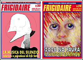 È appena stato spedito agli abbonati il n.269 di FRIGIDAIRE, novembre 2025, e presto verrà inviato anche il n.270 di dicembre. Si tratta di due uscite consecutive un po’ speciali. Il n.269 è dedicato alla figura del musicista Erik Satie, con testi eccezionalmente curati dalla pianista e cultrice di Satie Alessandra Celletti. Ma il fascicolo ospita anche due nuovi giovani autori: Nicolò Macalli, cui si deve il delicato disegno di copertina e Priamo Pinna, che fa da spalla con una sua tavola all’editoriale di Vincenzo Sparagna su “Arte, Mondo, Bellezza”. Nel n.270, copertina di Gianni Cossu, l’editoriale dal titolo "La speranza e l’orrore" è in un certo senso illustrato da una complessa e sorprendente immagine di Daniele La Placa, un piccolo viaggio fantastico nel corpo dilaniato della società contemporanea. Nel paginone un originale, allegrissimo e ottimistico Calendario del 2026, protagonisti i favolosi dolci del nostro Franco Neri, Ambasciatore del Gusto di Frigolandia, Leggi Tutto |